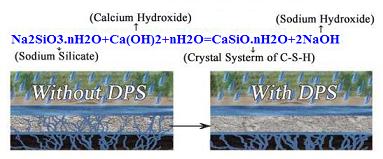 The inner alkali content of the concrete is about 360 times more thanthe surface’s, through the pores, DPS penetrates into the concrete structures, chemically reacts with the free alkalispresented in the concrete and forms silicate gel, which seals the micro cracks and capillary pores becomes the integral partof the concrete, strengthens the concrete structure, and blocks the harmful substances ingress; when water losses, it partlysolidifies into crystalline powder, let the concrete breathe freely, when meets with moisture or water, this reaction repeatsagain, thus, gives the concrete permanent waterproofing and protection, such as sealing, waterproofing, anti-permeating,hardening, dust-proofing, anti-corrosion etc.